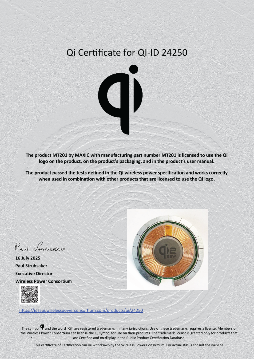 美芯晟自主研發(fā)的無(wú)線充電發(fā)射端模組已通過最新的Qi2.2.1認(rèn)證,Qi認(rèn)證ID為24250,料號(hào)為MT201,Qi無(wú)線充電功率達(dá)25W(MPP25),內(nèi)置美芯晟一芯多充無(wú)線充電發(fā)射端芯片MT5820,支持BPP、EPP和MPP(5W/15W/25W)三種功率配置。