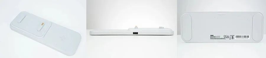 底座為扁平直板造型,四端以及邊緣過渡圓潤,表面啞光并有很多五顏六色小圓點(diǎn),使得底座整體看上去像花崗巖一般,右側(cè)凸起。無線充電區(qū)域設(shè)有十字膠墊,支持穩(wěn)定手機(jī)同時(shí)更好散熱。側(cè)面設(shè)有一個(gè)USB-A接口,黑色膠芯。底部兩側(cè)設(shè)有防滑膠墊,邊緣貼有產(chǎn)品銘牌貼紙。底座型號為SE-A61UW,支持12V1.5A輸入,USB-A輸出5V2A,無線充輸出最大10W,總輸出7.5W(無線充5W,USB-A口5V0.5A),產(chǎn)品通過了CE認(rèn)證。