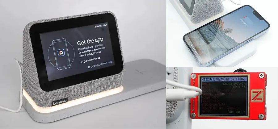 連接適配器并打開開關(guān),首先會出現(xiàn)一個(gè)讓用戶手機(jī)下載Google Home app的提示界面,即產(chǎn)品支持手機(jī)app智能控制,設(shè)置簡單方便。底座上的氛圍燈亮白光。同時(shí)可以將手機(jī)放在底座右側(cè)進(jìn)行無線充電,晚上入睡前為手機(jī)充電變得更加方便。使用ChargerLAB POWER-Z KT002測得USB-A口只支持Samsung 5V2A、DCP協(xié)議。