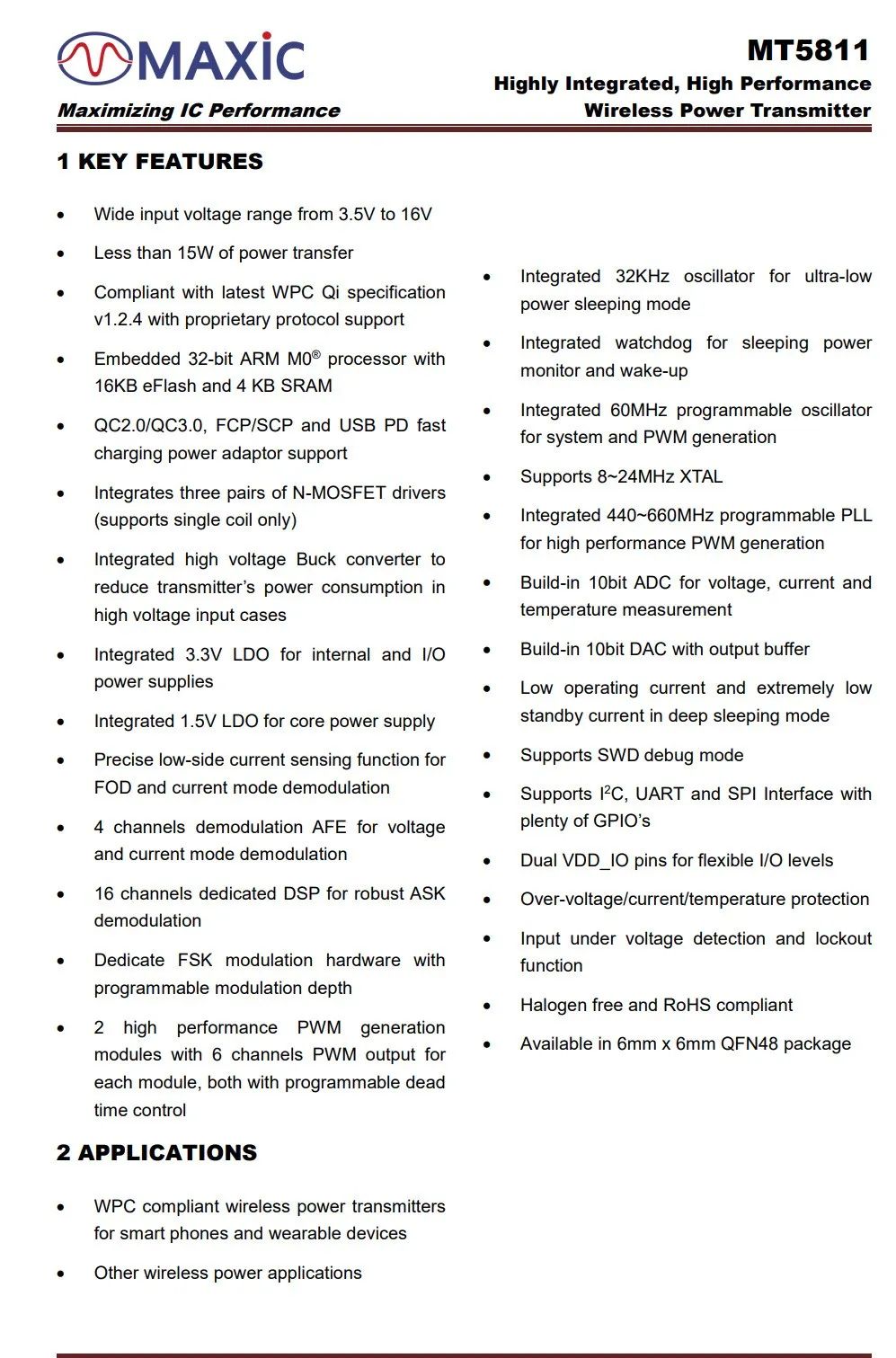 無線充電芯片來自美芯晟,型號為MT5811,是一款集成USB PD、QC等快充協(xié)議、高度集成的符合Qi標(biāo)準(zhǔn)的無線充電發(fā)射芯片,支持15W輸出功率。MT5811集成ARM M0 處理器,擁有卓越的高效率和緊湊設(shè)計(jì),提供強(qiáng)大、自主的二次開發(fā)空間。芯片內(nèi)部集成3對NMOS驅(qū)動(dòng)器,可用于單線圈應(yīng)用的無線充電器,支持定頻調(diào)壓控制,無需外置驅(qū)動(dòng)器。
