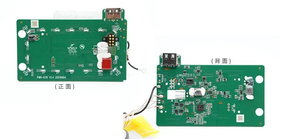 無線充電PCBA模塊正面特寫,邊緣為一圈LED燈,配合外殼上的導(dǎo)光條營造燈光效果。右側(cè)為連接時(shí)鐘的鍍金觸點(diǎn),用于為底座供電。無線充電PCBA模塊背面為一路完整的無線充電電路和用于USB降壓輸出供電的降壓電路。