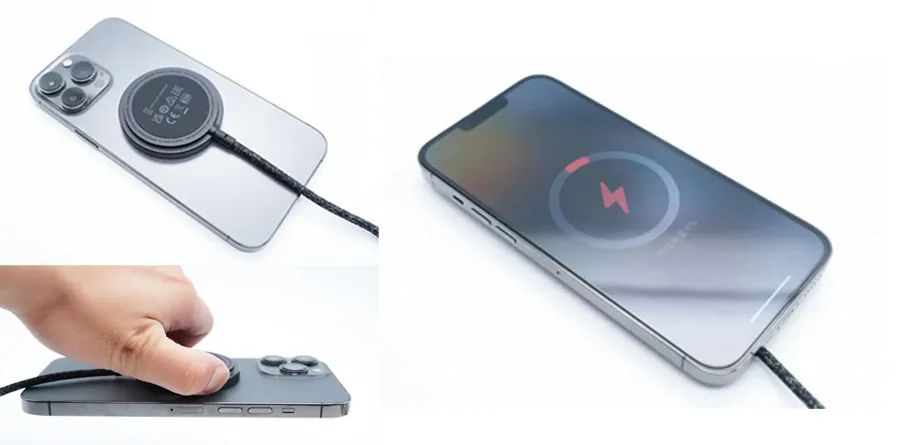 產(chǎn)品使用場(chǎng)景一覽,和iPhone13 Pro Max相比,顯得很小巧。另外產(chǎn)品可以輕松將蘋(píng)果這款手機(jī)吸附起來(lái),吸附力很好。通電后可以正常給手機(jī)進(jìn)行無(wú)線(xiàn)充電。