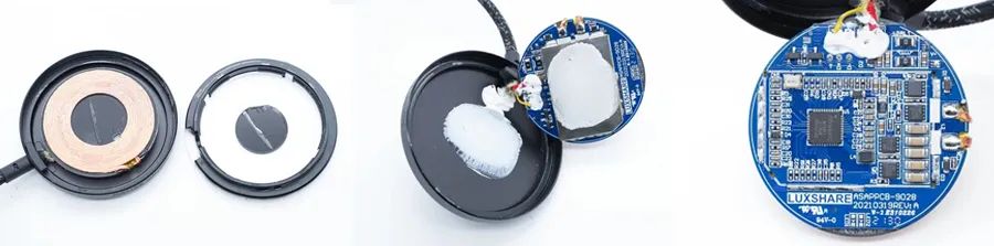 首先沿?zé)o線(xiàn)充外殼接縫撬開(kāi)外殼,鋁合金外殼內(nèi)部是無(wú)線(xiàn)充驅(qū)動(dòng)電路以及線(xiàn)圈,白色面板固定在塑料支架上,與鋁合金外殼之間通過(guò)卡扣固定。電路板背面焊接屏蔽罩,屏蔽罩使用膠水固定在無(wú)線(xiàn)充電器外殼內(nèi)部。無(wú)線(xiàn)充內(nèi)置一塊圓形電路板,上方焊接輸入U(xiǎn)SB-C導(dǎo)線(xiàn),右側(cè)焊接無(wú)線(xiàn)充電線(xiàn)圈,下方為指示燈焊盤(pán),預(yù)留有指示燈的位置。