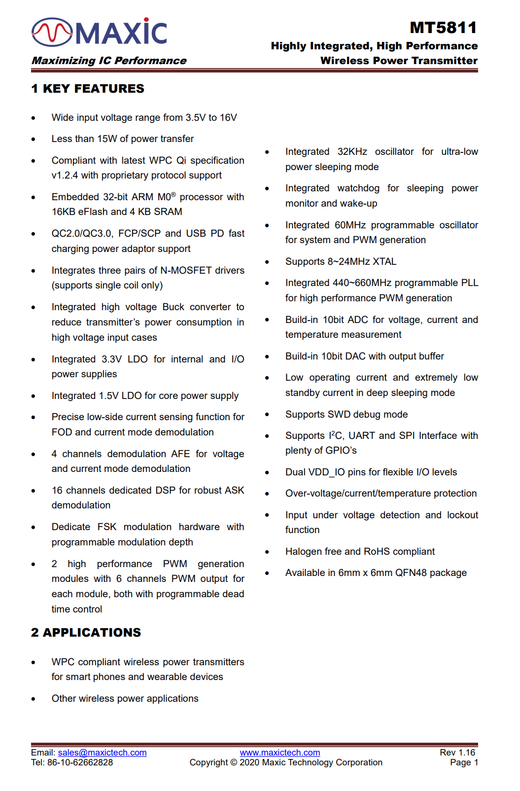 無(wú)線(xiàn)充電主控芯片采用美芯晟MT5811,這是一顆高度集成的無(wú)線(xiàn)充電SoC,支持3.5-16V寬范圍供電,支持小于15W的無(wú)線(xiàn)充電應(yīng)用,芯片符合WPC Qi 1.2.4規(guī)范,并支持私有充電協(xié)議,芯片內(nèi)部集成32位M0處理器,16KB eFlash和4KB SRAM。