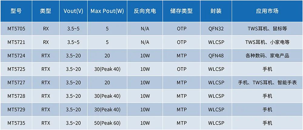 此次展示的接收端產(chǎn)品有MT5705,MT572X系列以及MT5735。功率覆蓋5W至50W,根據(jù)市場需要可支持反向充電功能,產(chǎn)品可廣泛應(yīng)用在手機(jī)、智能手表、TWS耳機(jī)、小家電、數(shù)碼等智能產(chǎn)品中。