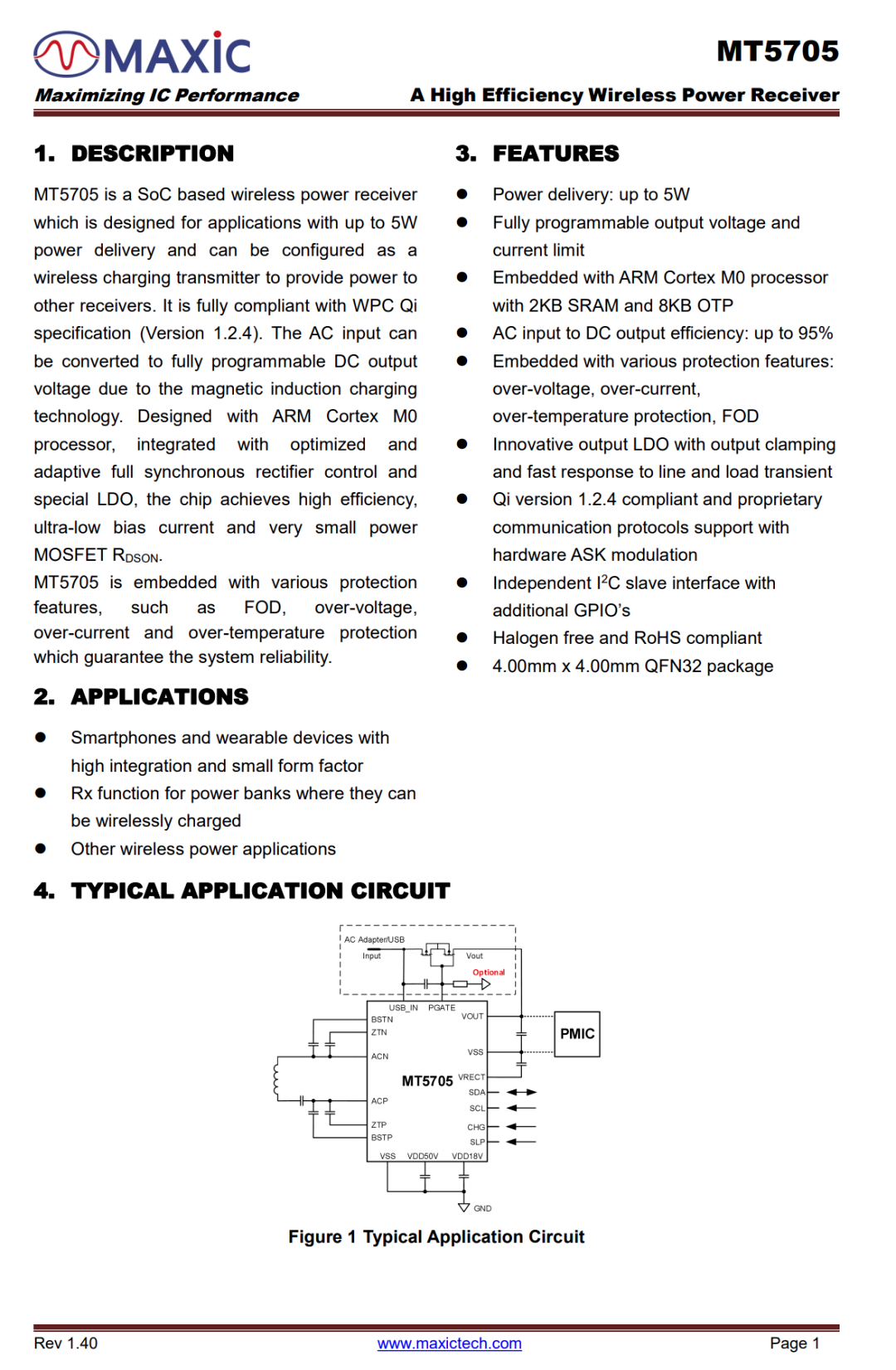 MT5705 is a SoC based wireless power receiver that incorporates ARM Cortex M0 processor, 2kB SRAM, 8kB OTP, and is fully compliant with WPC Qi specification (V1.2.4) of BPP.