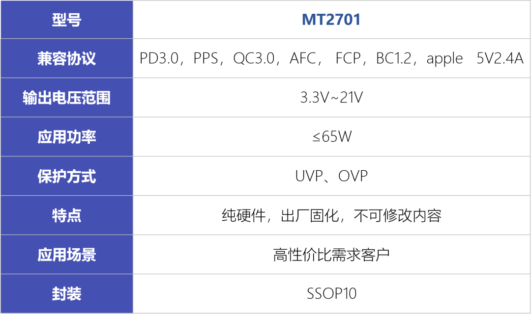 美芯晟開發(fā)的快充協(xié)議芯片包括MT2701和最新的MT280X系列,芯片兼容多種快充協(xié)議。MT2701支持65W以內(nèi)應(yīng)用,兼容PD3.0,PPS,QC2,QC3,AFC,F(xiàn)CP,私有協(xié)議低壓直充5V4.5A,Apple 5V2.4A,BC1.2等常用協(xié)議。MT2701采用純硬件架構(gòu),通過外部元件來調(diào)節(jié)輸出功率段,應(yīng)用簡(jiǎn)單,BOM成本低,適合不需要USB-IF認(rèn)證的客戶。