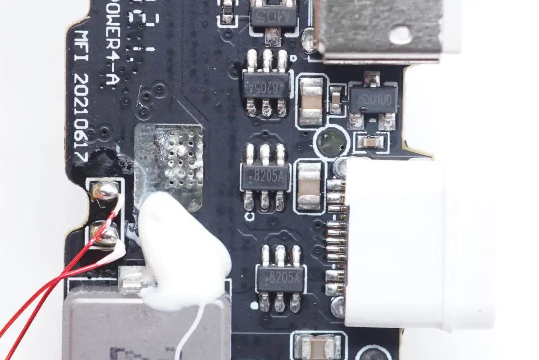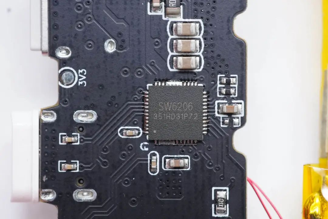 移動電源主控芯片采用智融SW6206。這是一款高集成度的多協(xié)議雙向快充移動電源專用多合一芯片,支持A+A+B+C+L口任意口快充。其集成了5A高效率開關充電,22.5W高效同步升壓輸出。