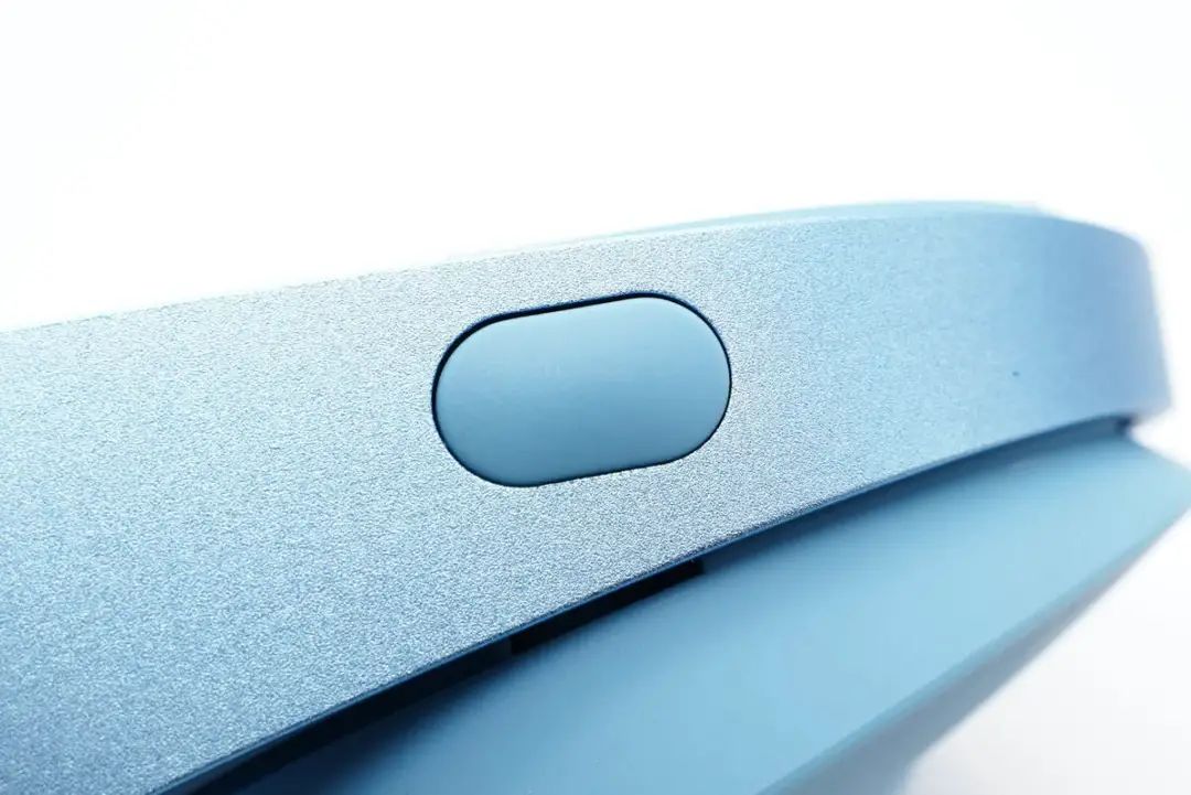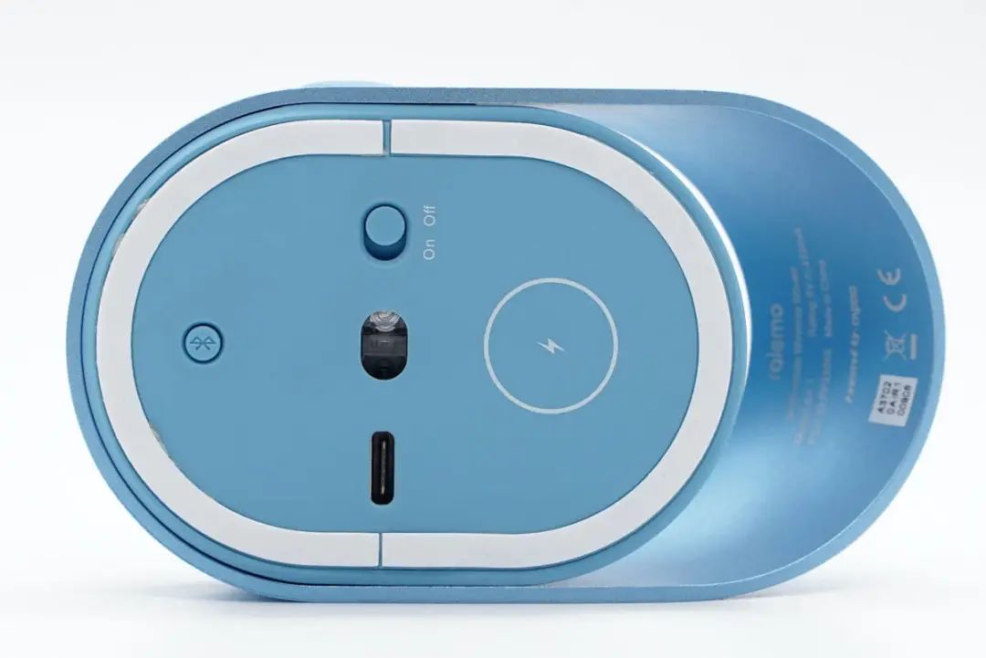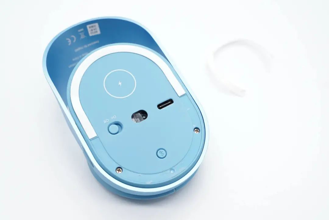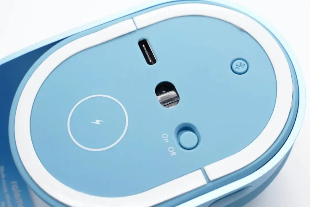 鼠標(biāo)底部邊緣貼有白色聚四氟乙烯腳墊,兩端分別是藍(lán)牙鍵和無(wú)線充電標(biāo)識(shí),兩側(cè)是USB-C充電口和電源鍵。