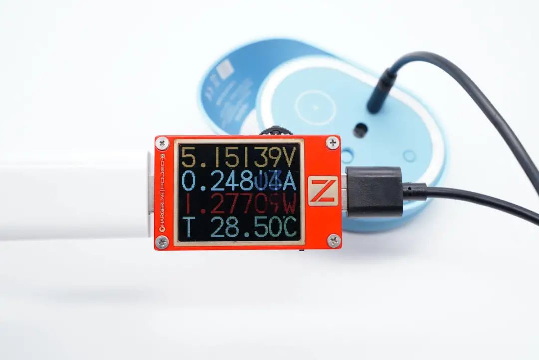 另外進(jìn)行有線充電測(cè)試,使用KT002可以測(cè)得充電功率為5.15V 0.25A 1.28W。
