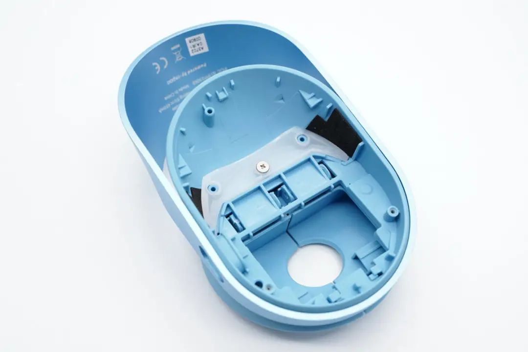 將鼠標(biāo)底部白色腳墊撕下,底部外殼使用螺絲固定。
