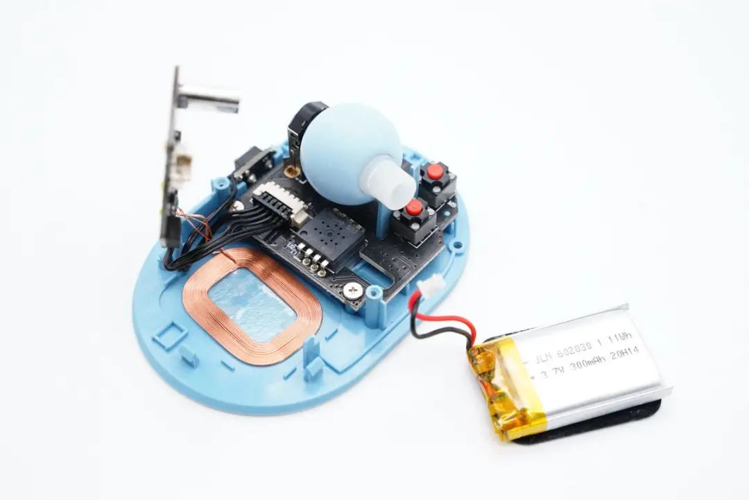 兩塊小板之間也是通過(guò)導(dǎo)線插拔式連接,無(wú)線充電線圈使用雙面膠粘貼在底板上。