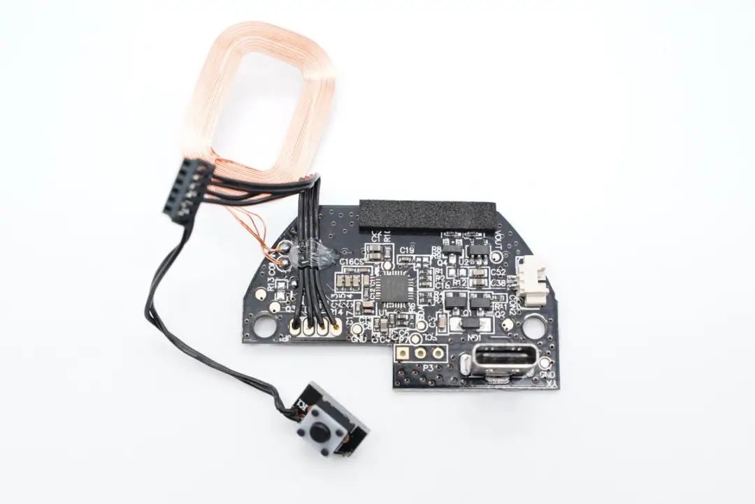 小板正面一覽,垂直焊接USB-C輸入母座,右側(cè)是電池插座,左側(cè)連接導(dǎo)線和無(wú)線充電線圈,中心是無(wú)線充電接收芯片。