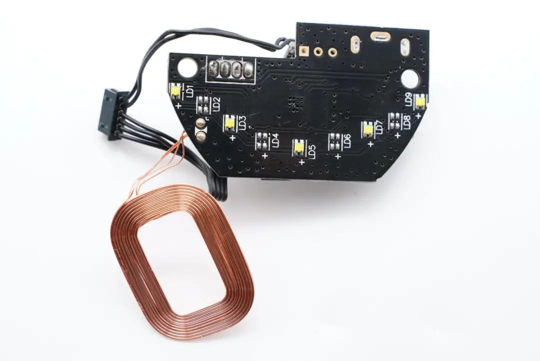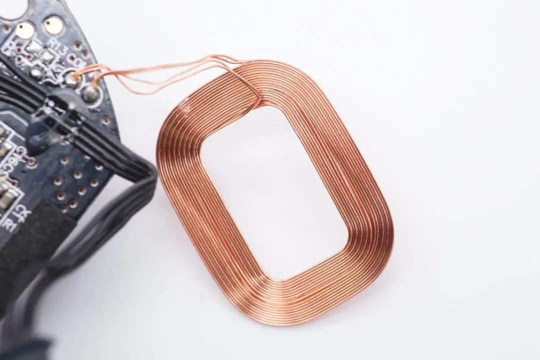 無(wú)線充電接收線圈特寫(xiě),漆包線繞制,隔磁片粘貼在電池上。