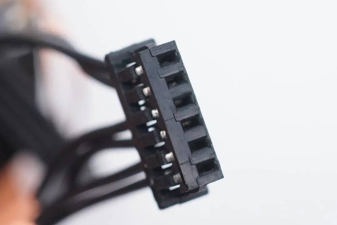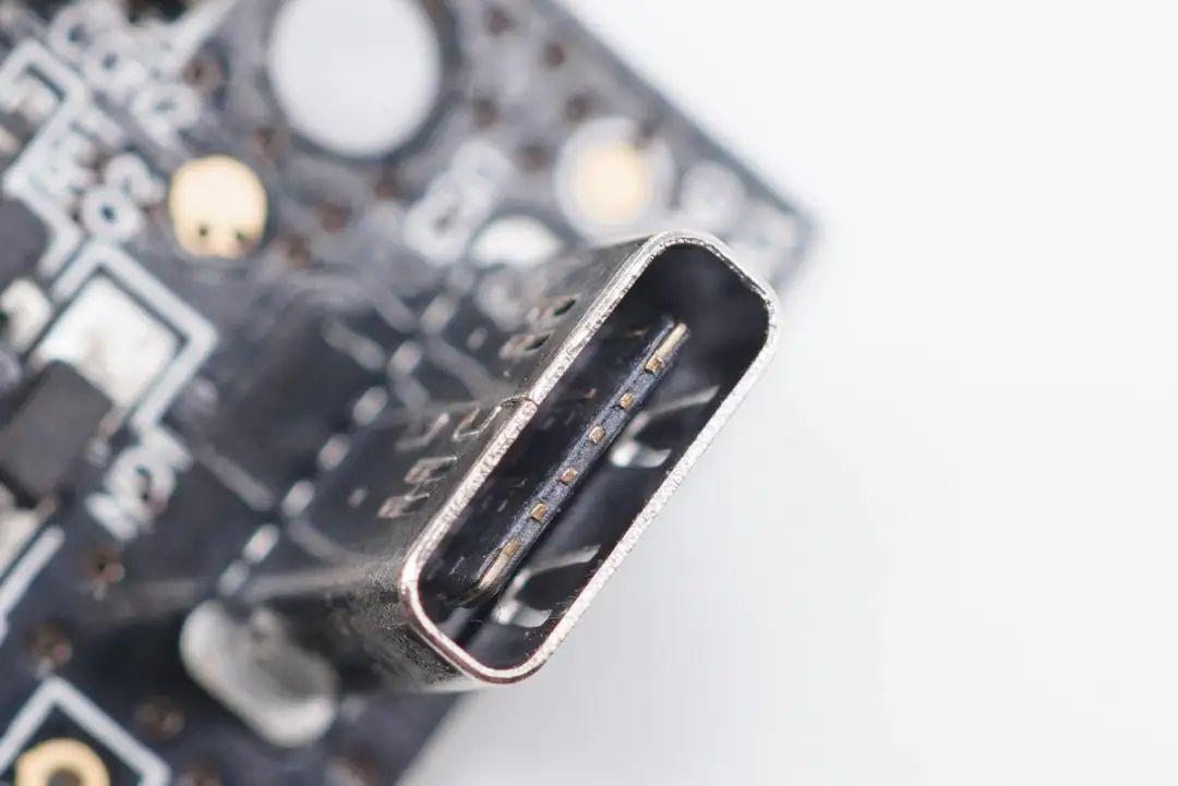 USB-C輸入母座特寫(xiě),垂直過(guò)孔焊接。