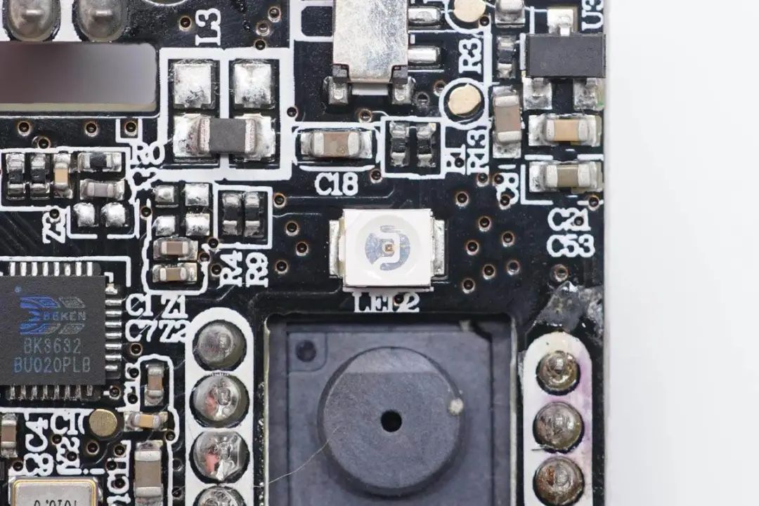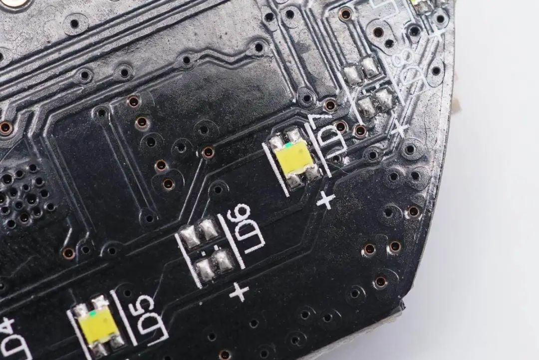 發(fā)光二極管特寫(xiě),下方的光電感應(yīng)器底部中心設(shè)有小孔。