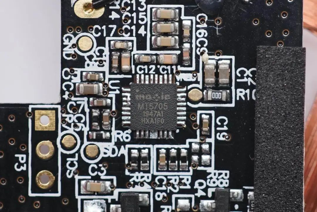無(wú)線充電接收芯片采用美芯晟MT5705,上方三顆諧振電容并聯(lián)。MT5705是一款基于磁感應(yīng)的無(wú)線充電接收器的SoC(片上系統(tǒng)),采用嵌入式ARM Cortex M0處理器,2KB SRAM, 8KB OTP,完全符合BPP的最新WPC Qi規(guī)范(版本1.2.4)。