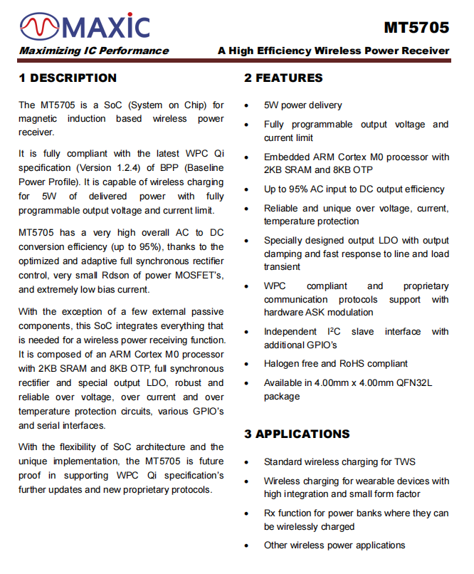 MT5705可提供穩(wěn)定的5W輸出功率,支持輸出電壓5V和電流最大1A,AC to DC轉(zhuǎn)換效率達(dá)95%;其擁有完善的過(guò)壓、過(guò)流、過(guò)溫保護(hù)機(jī)制,獨(dú)立的I2C通信接口和豐富的GPIO。封裝為4.00mm x 4.00mm QFN32L,尤其適合TWS耳機(jī)充電倉(cāng)等各類(lèi)小功率智能設(shè)備。