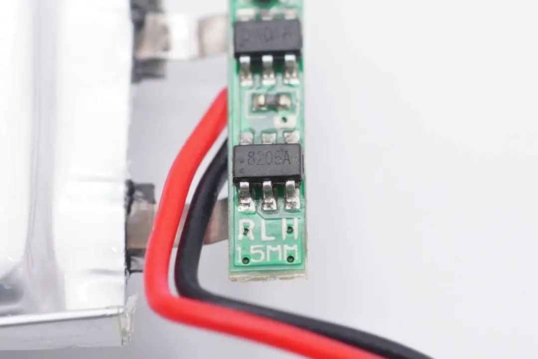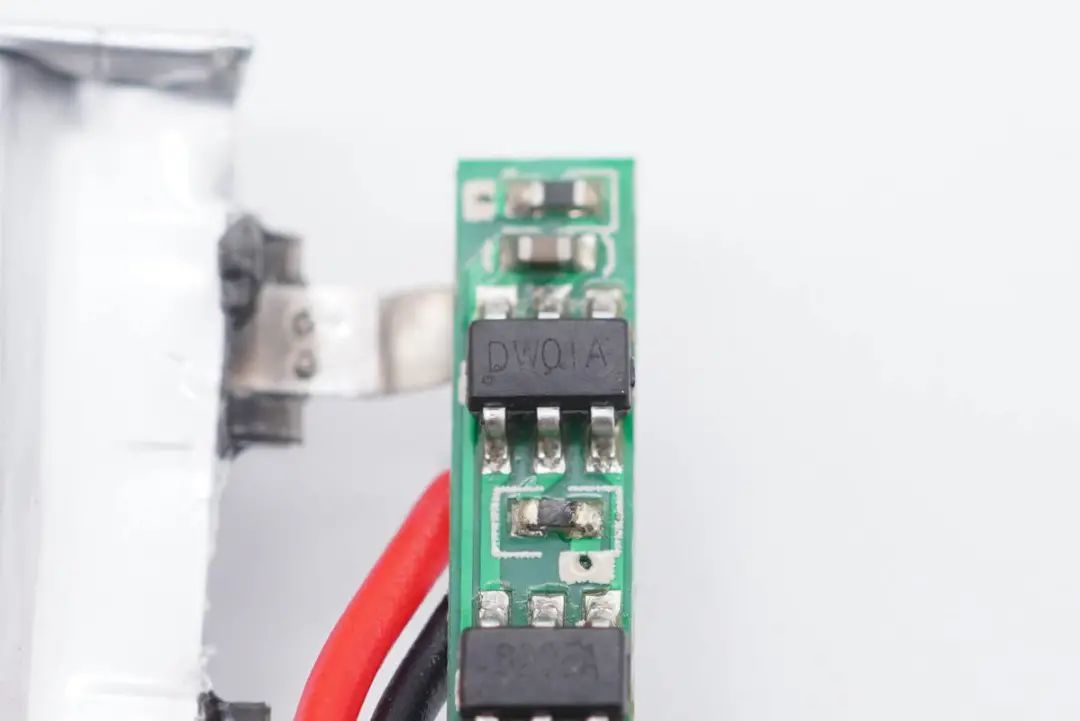 電芯頭部設(shè)有一塊保護(hù)小板,小板上設(shè)有鋰電保護(hù)芯片和MOS管。