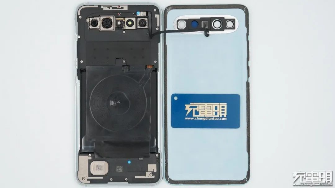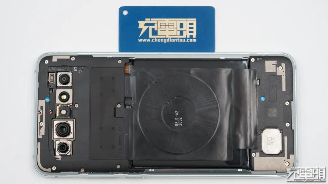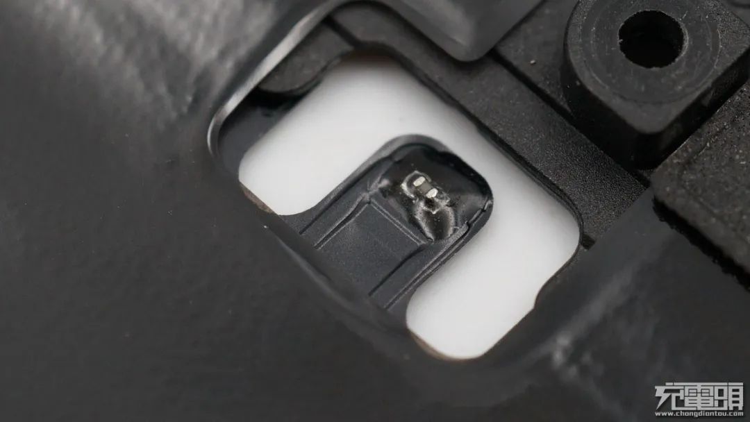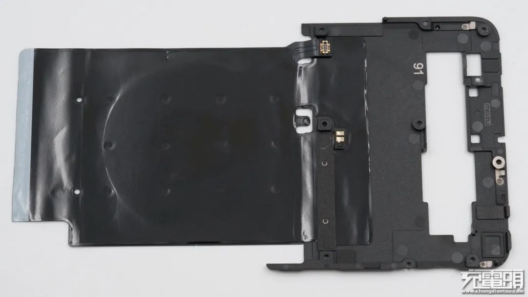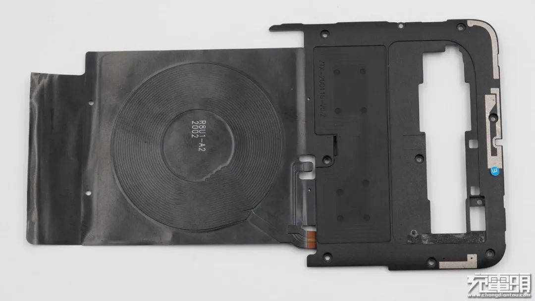背面一覽,無(wú)線充電線圈與主板通過(guò)連接器連接,方形觸點(diǎn)為NFC線圈觸點(diǎn)。
