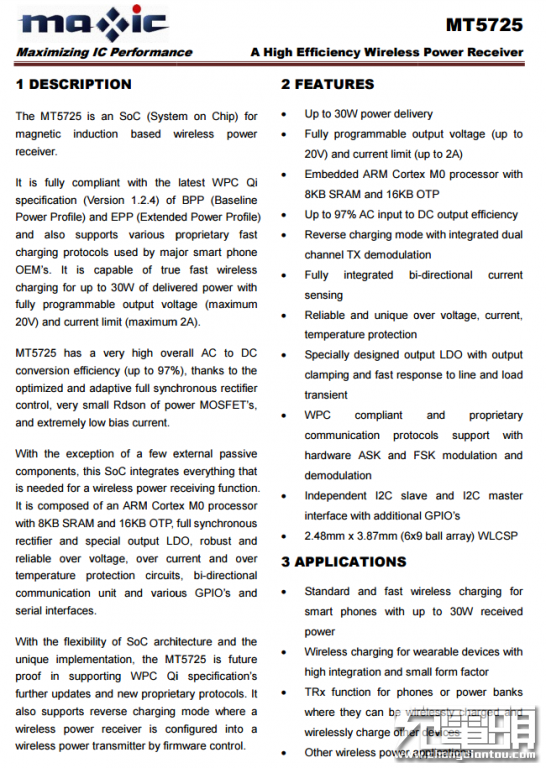 無(wú)線充接收芯片采用美芯晟MT5725。MT5725是一款基于磁感應(yīng)的SoC高集成無(wú)線充電接收芯片,集成了無(wú)線充電接收功能所需的一切,可提供高達(dá)30W的輸出功率。并具有非常高的整體AC/DC轉(zhuǎn)換效率(高達(dá)97%)。