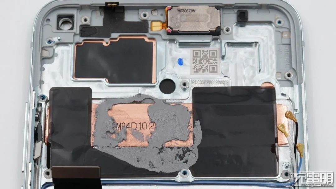 電池和主板之間為插座可拆卸設(shè)計(jì),組裝方便,也方便后面對(duì)電池進(jìn)行更換等服務(wù),同時(shí)電池保護(hù)板背面與鋁合金中框之間還有一條導(dǎo)熱硅膠,在高速充電時(shí)可為保護(hù)板散熱,降低溫升。
